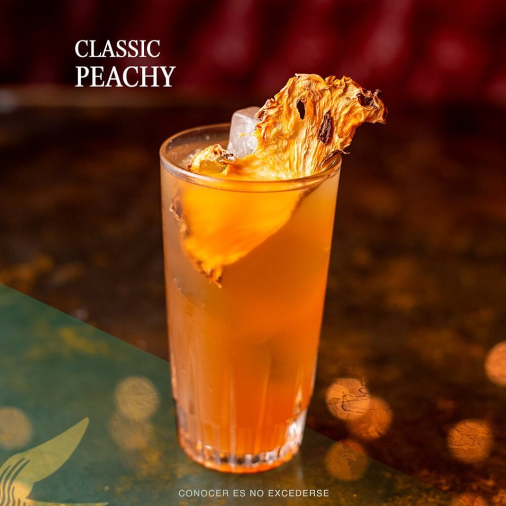 • En un vaso highball previamente frío agregar las rebanadas de durazno, jarabe de miel de abeja y Matusalem Clásico.